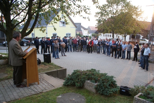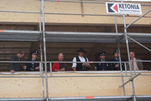 Von einem Freudentag für die Gemeinde sprach Bürgermeister Gerhard Scharl vor dem fertiggestellten Rohbau gegenüber Gemeinderäten, Feuerwehrverantwortlichen und -leuten und der großen Zahl an freiwilligen Helfern. Erst vor vier Monaten erfolgte der erste Spatenstich. Scharl sprach von einer Bravourleistung, die in erster Linie mit einem Namen verknüpft ist, dem von Altbürgermeister und Projektleiter Hans Götz. Götz organisiert und koordiniert die Anlieferung von Baumaterial ebenso wie den Einsatz der freiwilligen Arbeiter für Mauerer-, Gerüstbau-, Zimmerer-, Installations- und Dachdeckerarbeiten. 567 Stunden schlagen bei Götz in Sachen Feuerwehrhausbau bisher zu Buche. Ortsansässige Firmen unterstützen das Projekt kostenlos mit Arbeiten und Material. Der Gemeindechef hob die mustergültige Begleitung der Baumaßnahme durch das Ingenieurbüro Michael Ederer heraus. Die Gemeinde selbst habe 154.000 Euro für Lieferleistungen eingeplant. Mittlerweile sind 129.000 Euro vergeben. Für den Rohbau allein waren es 63.057 Euro. Die Dimension des Gebäudes ist mit elf auf 17 Metern und einer Fläche von 320 Quadratmetern zukunftsorientiert. Kommandant Matthias Wirth nannte es fantastisch, was hier im Entstehen sei. "Vom ursprünglich geplanten kleinen Anbau für einen zweiten Stellplatz stehen wir nun vor einem Bauwerk, das optimalste Voraussetzungen für die Feuerwehr und seine Aktiven garantiert". Das Engagement der Gemeinde und vor allen Dingen der Bürger zeige, welchen Stellenwert die Feuerwehr in der Gemeinde einnehme. "Wir freuen uns darauf, dieses Haus zu beziehen." Vorsitzender Thomas Bausch dankte allen, die dazu beitragen, das Vorhaben "wir bauen uns selbst das Feuerwehrhaus" zu verwirklichen. Zimmerer Pregler nagelte mit Ingenieur Ederer den Richtbaum an die Balken, sprach den Richtspruch und stieß mit den Beteiligten mit Sekt auf das Bauwerk an. Zum Richtfest waren dann alle Helfer und Offiziellen in die Turnhalle zum von Vereinswirt Heribert Renner spendierten Essen eingeladen.