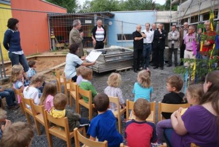 Vor dem Rohbau saßen die Mädchen und Buben und sangen mit ihrer Leiterin Kathrin Steudel "Kommt herein und tretet ein, freut euch mit uns, klatscht und singt, weil das Richtfest jetzt beginnt". Bürgermeister Scharl zeigte sich zufrieden, dass die Arbeiterwohlfahrt die Trägerschaft übernimmt.