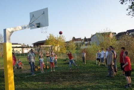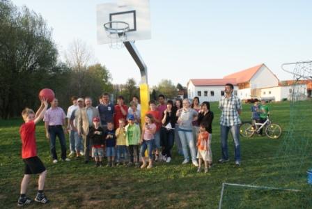 Trebsauer Neubürger investieren Erlös aus Fest in Basketballkorb für Spielplatz. Die Bürger des Trebsauer Neubaugebietes spendeten den Erlös ihres Nachbarschaftsfestes. Bei einer improvisierten Einweihung stellte Bürgermeister Gerhard Scharl heraus, dass eine Umfrage, die er mit Jugendbeauftragtem Markus Zielbauer gestartet habe, genau diese Forderung beinhaltet habe. "Wir werden das Tor vom Bolzplatz noch etwas versetzen und den Umkreis vor dem Basketballkorb wetterfest anlegen", kündigte Scharl nächste Schritte an. Lukas machte den ersten Wurf in Trebsau. Wenn er noch einen weiteren Wunsch hätte, wäre dies eine wetterfeste Tischtennisplatte. Vielleicht gibt's heuer ein zweites "Baugebietsfestl". Dann könnte die Platte eventuell drin sein.