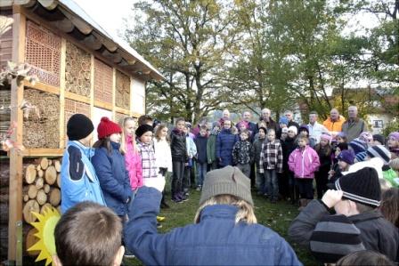 Die erste Schulstunde im Freien fand schon statt. Die Kinder der vierten Klasse begrüßten Gäste, Helfer und Sponsoren des Projekts mit einem Flötenlied und trugen Gedichte vor. Rektorin Elke Schosser versprach, im Heimat- und Sachkundeunterricht mit den Buben und Mädchen genau zu beobachten, wer das Hotel bezieht. "Welche Zimmer besonders gut gebucht werden, und welche Tiere sich ihren Weg ins Freie bahnen, werden wir dann sehen". Das Insektenhotel steht in einer windstillen Ecke hinter einer Hecke, so dass sich die Gäste wohlfühlen. Die Schüler hoffen, dass sie nun Beobachtungen über seltene Bienen- und Wespenarten wie die Löcherbienen, Grab- oder Gold- und Gichtwespen machen können. "Doch wir müssen Vollpension anbieten und brauchen eine Umgebung mit vielen Kräutern, Wildpflanzen und einheimischen Sträuchern und Bäumen", gab Schosser zu bedenken. Bürgermeister Gerhard Scharl freute sich über den kleinen Bau, der die Gemeinde nichts gekostet hat. Spendiert haben ihn Reinhard Bücherl und Michael Argauer. Aufgestellt haben das Haus die Helfer um Wolfgang Schrepl, das Baugeschäft Reim-Kraus und Michael Pregler. Unter der Leitung von Silvia Löffler trug die 4. Klasse ein Spiel vor, in dem sie zeigten, wie Insekten und Blumen sich ergänzen. Mit einem Glas Sekt stießen die Erwachsenen auf das gute Gelingen an.